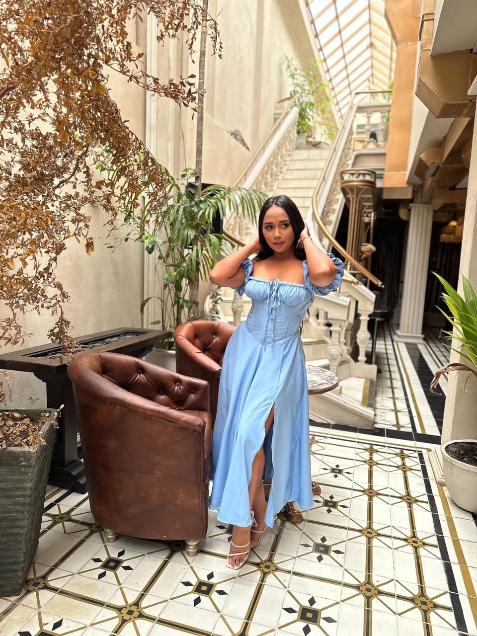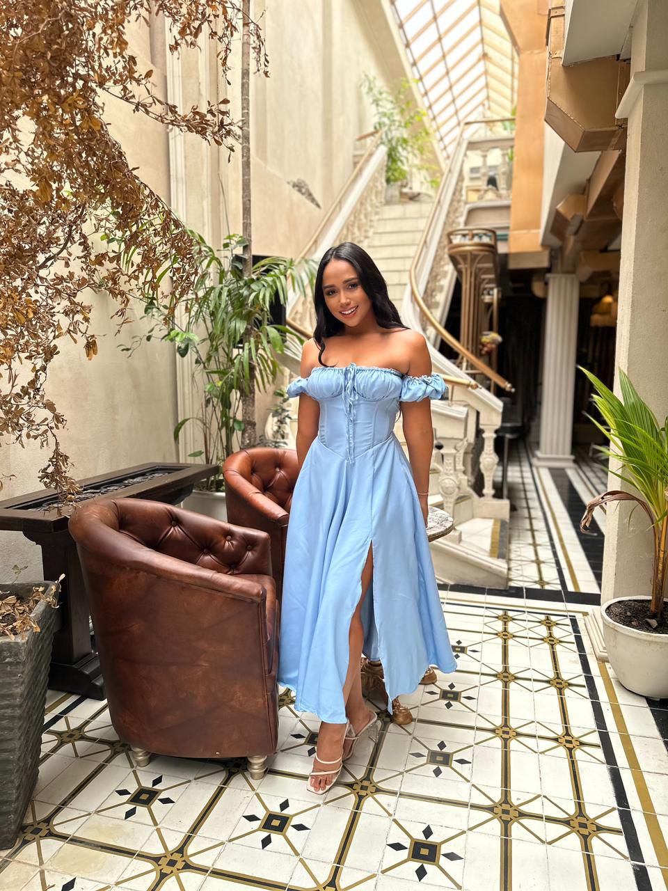 La espalda tipo corsé con amarre ajustable permite entallar la prenda a la medida del cuerpo, mientras que la abertura frontal en la falda aporta movimiento y sofisticación. Un diseño pensado para resaltar la silueta con gracia y seguridad.