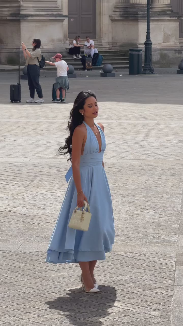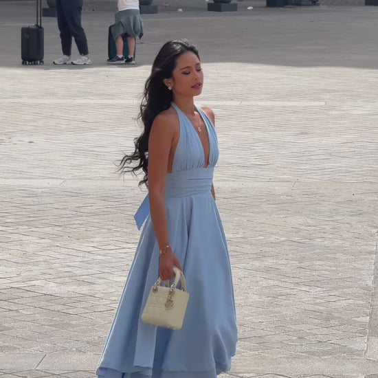 Déjate llevar por la elegancia clásica con este vestido de silueta fluida y escote halter drapeado. Su falda de vuelo medio y doble capa aporta volumen sutil y un movimiento encantador a cada paso. Perfecto para ocasiones especiales, escapadas románticas o simplemente para sentirte como en una película.