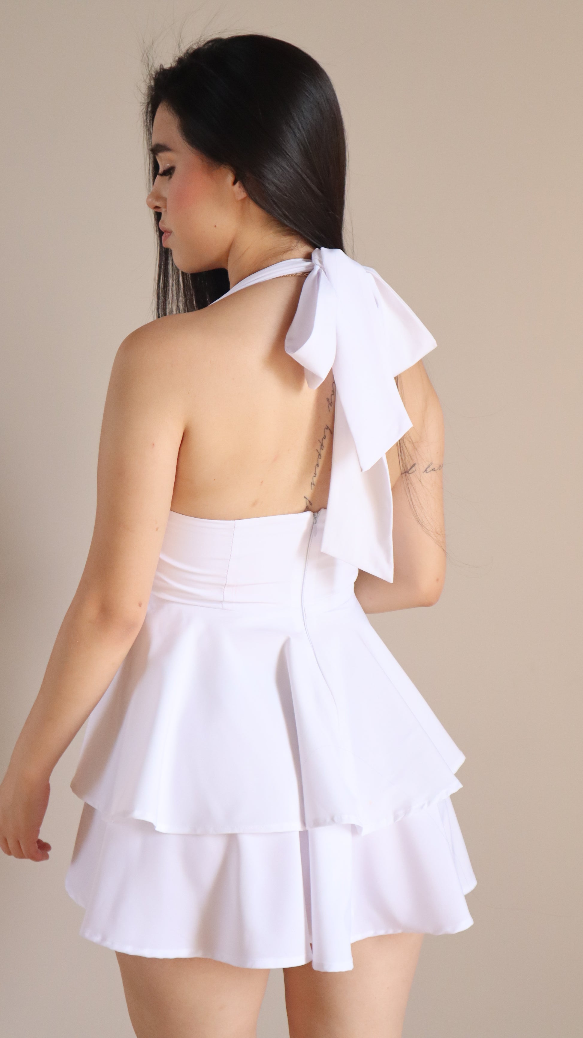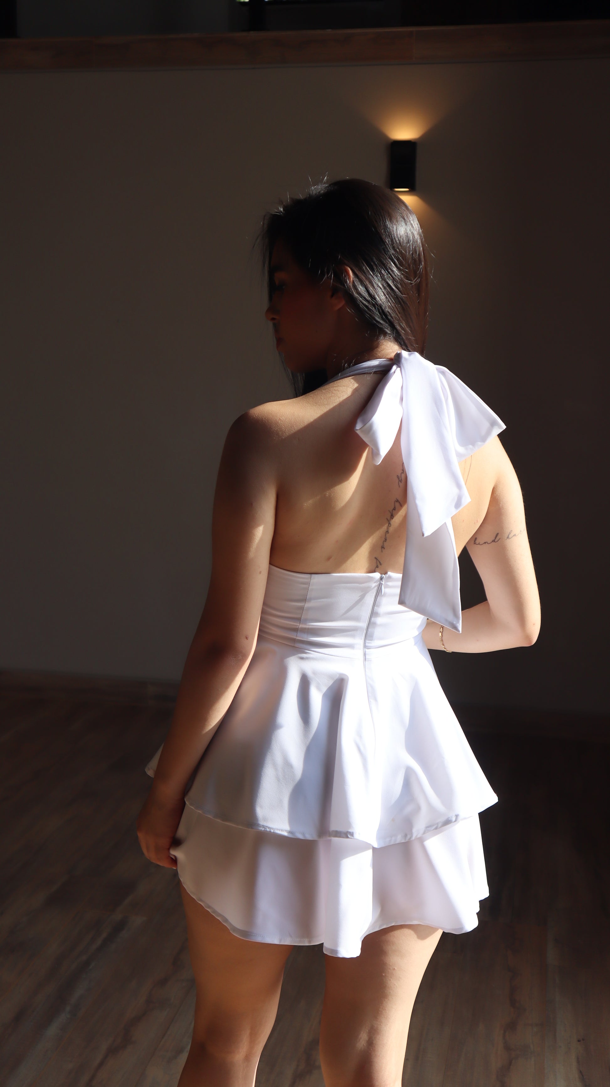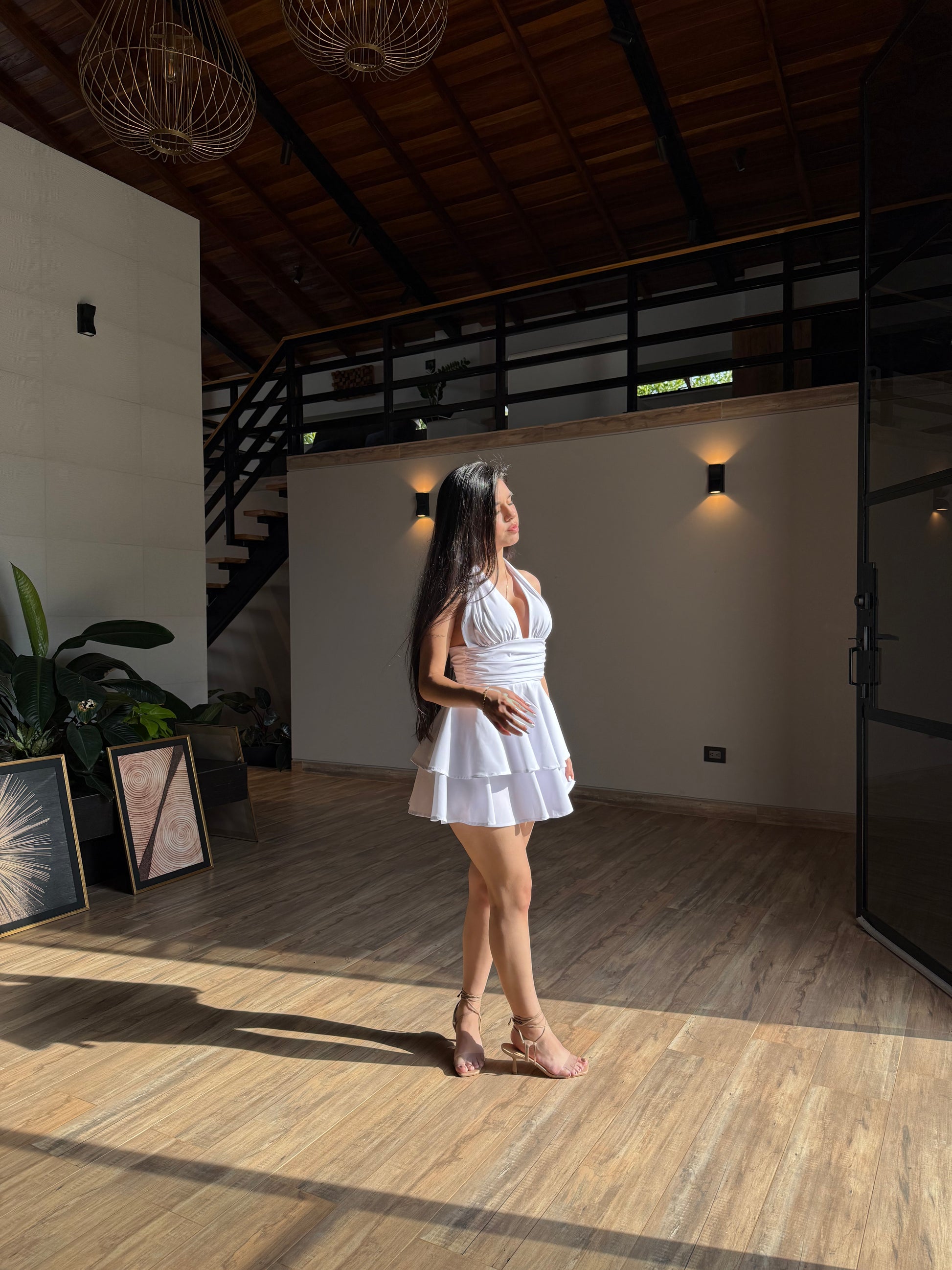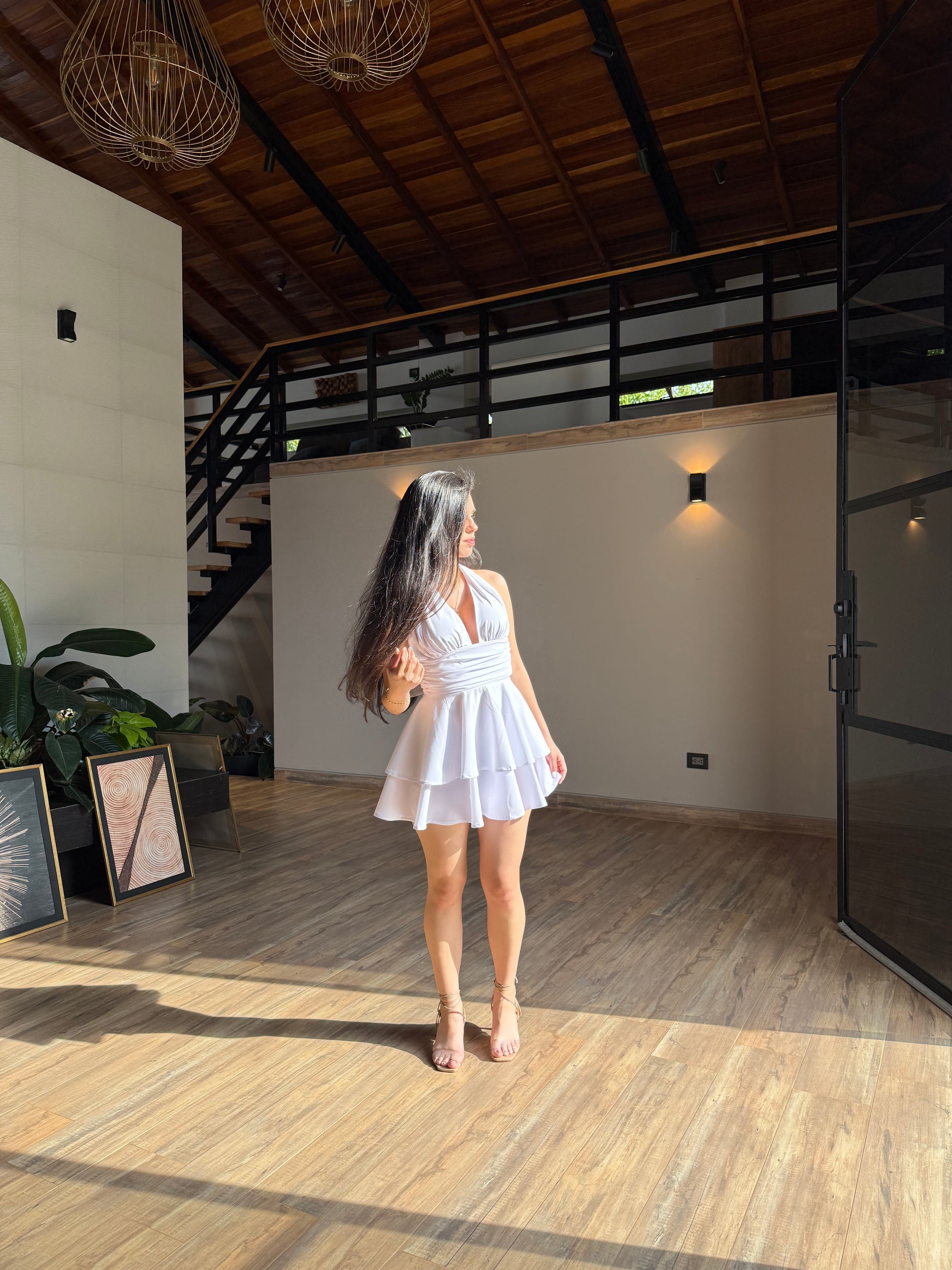 Sé el centro de todas las miradas con el Alice en versión mini, un diseño icónico que exuda feminidad, sensualidad y elegancia. Su escote halter drapeado y su falda en capas crean una silueta sofisticada y favorecedora, perfecta para momentos inolvidables.