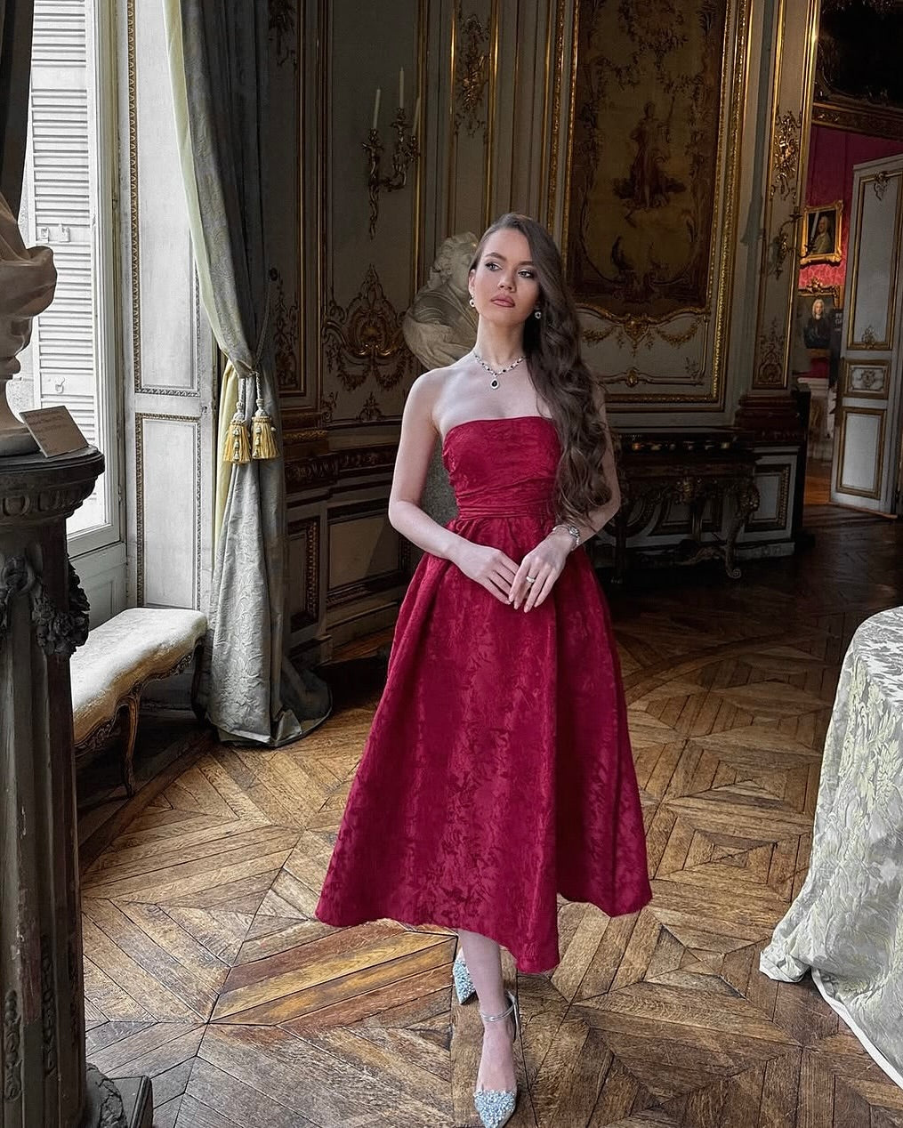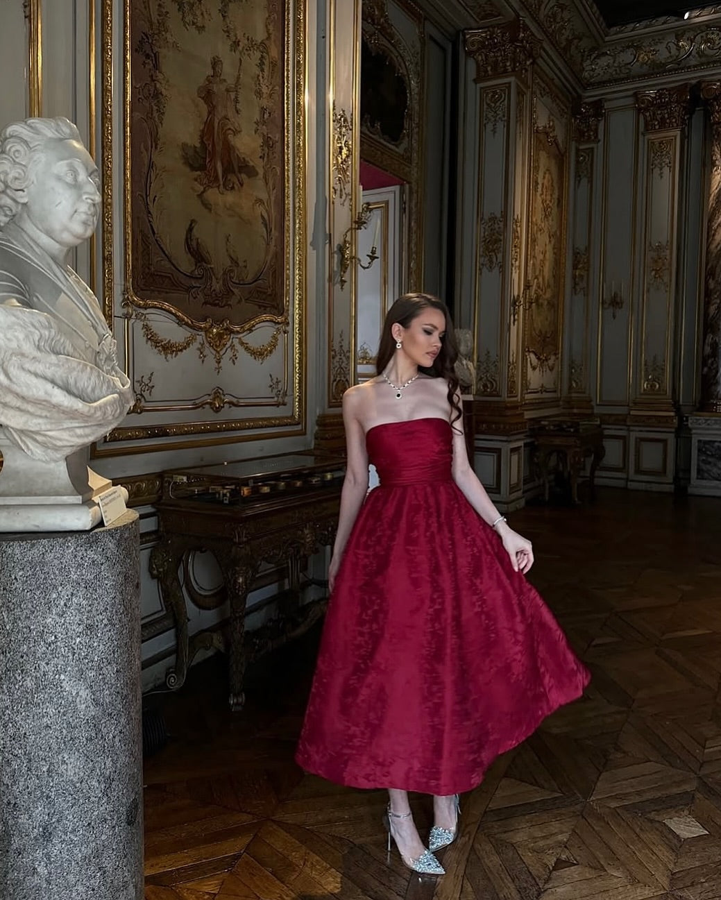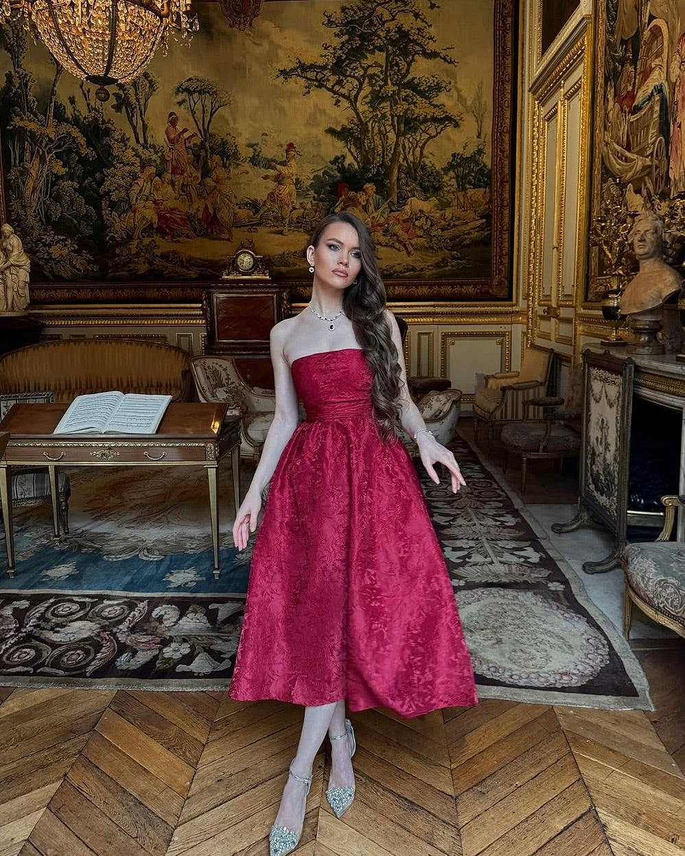 ‘ELENORA’ deslumbra con su silueta romántica y dramática: un corset estructurado que define la cintura, falda midi con volumen amplificado gracias al forro en tul, y un escote limpio que enmarca la parte superior con sofisticación.