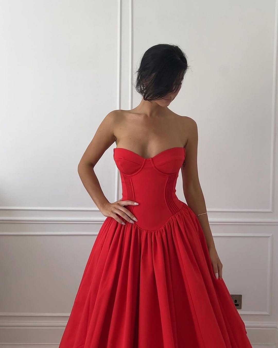 Diseñado para las noches que merecen ser inolvidables, el vestido Emma combina sensualidad y sofisticación con una silueta imponente. Su escote tipo corazón y estructura tipo corset estilizan el torso con precisión, mientras que la falda de caída amplia y fluida añade drama y movimiento a cada paso.
