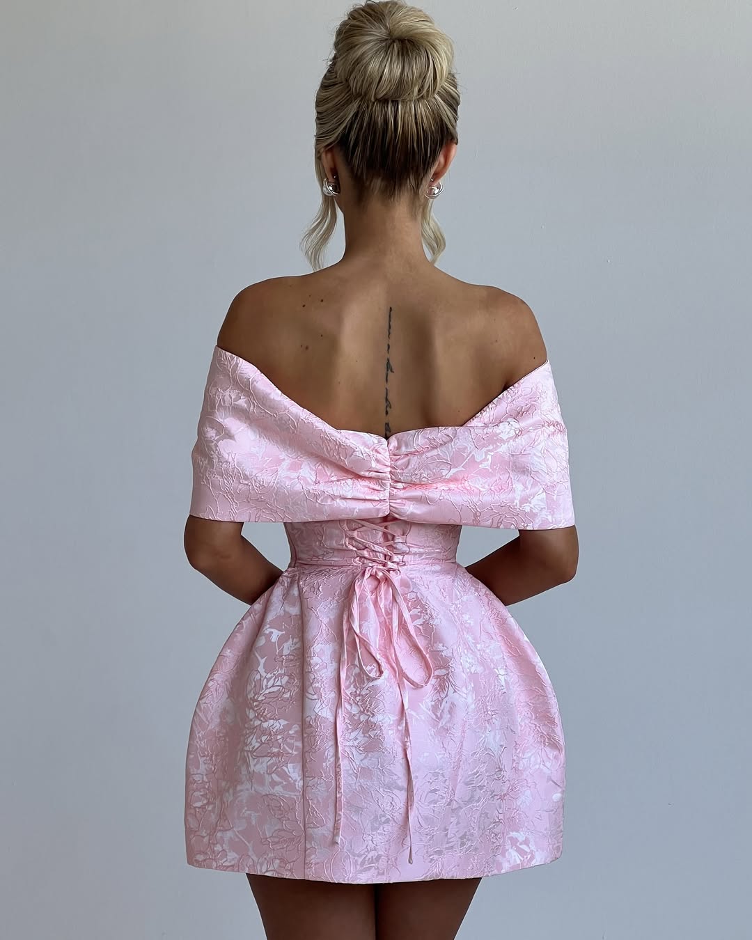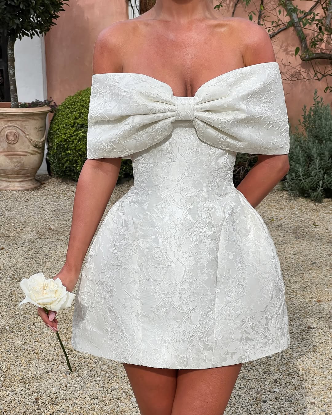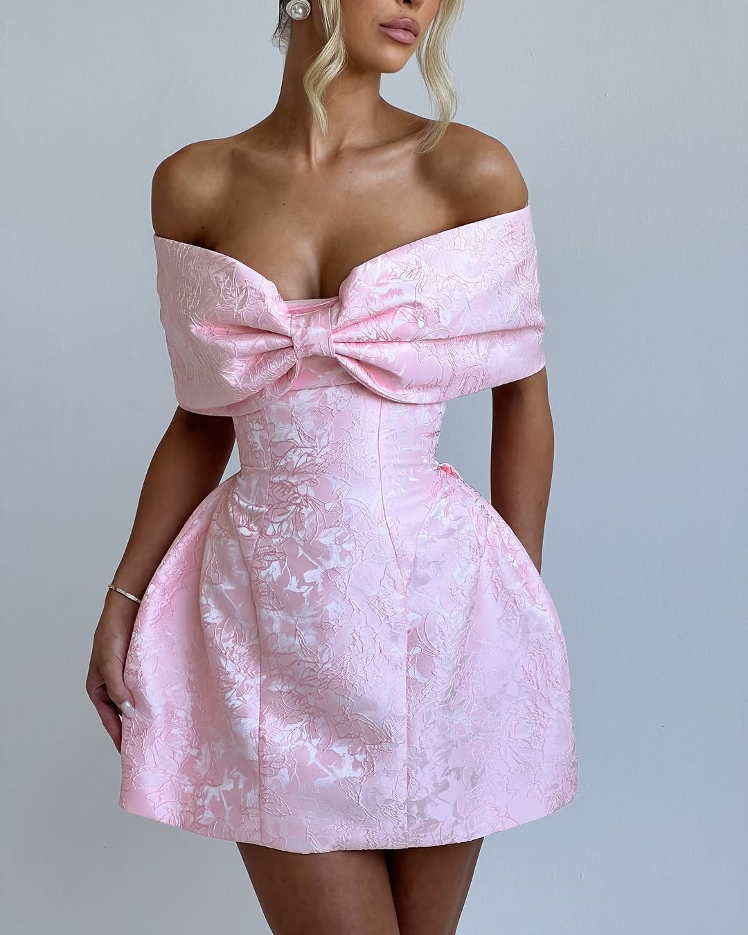 ‘KATRINA’ es la expresión máxima de feminidad y elegancia con su escote bardot adornado por un lazo XL que realza el escote y crea una silueta de impacto. La falda estructurada estilo campana define la cintura, mientras el corset con amarre posterior asegura un ajuste perfecto.