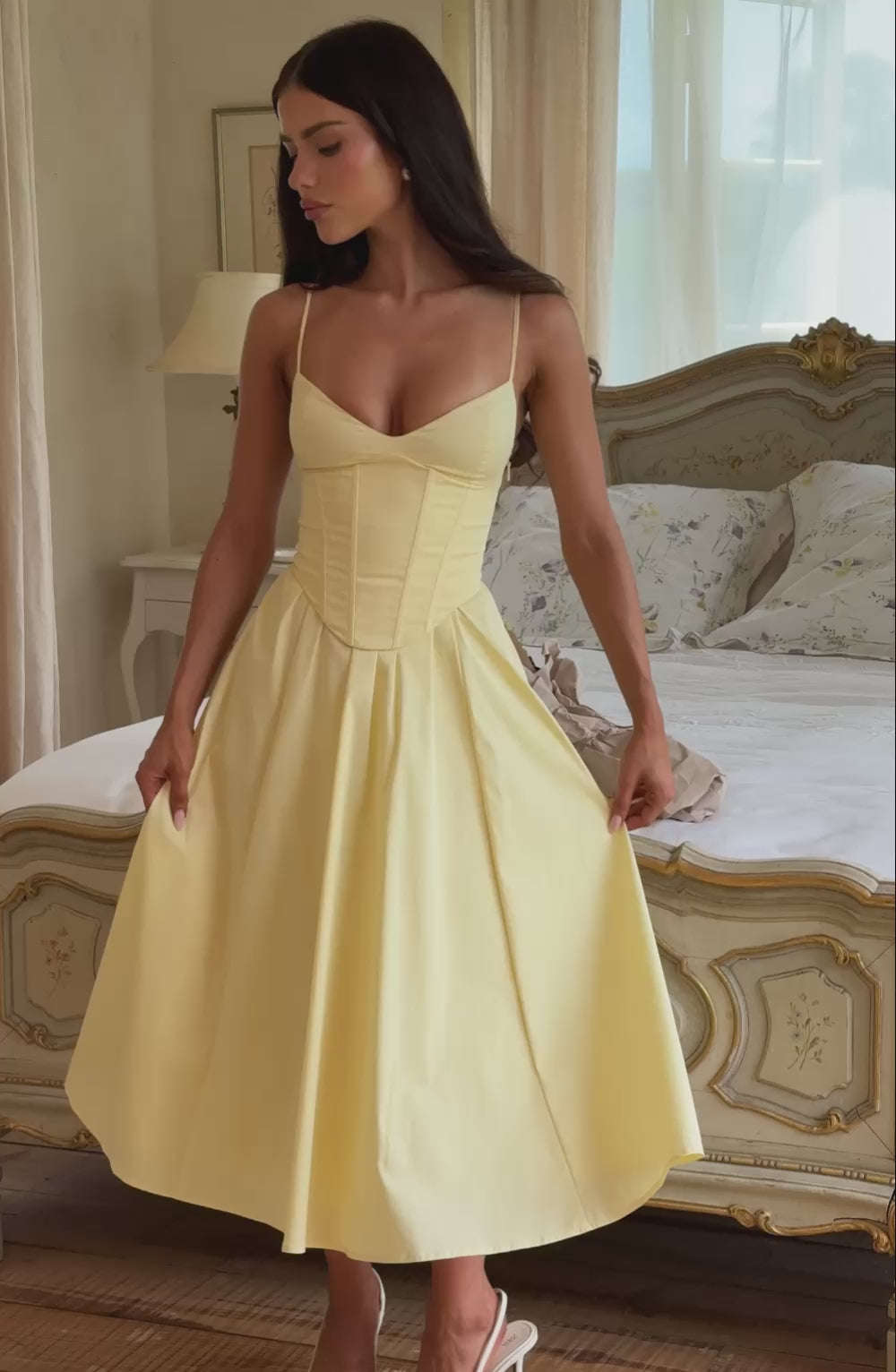 Pura elegancia con un toque romántico. Este vestido midi es una declaración de feminidad clásica, diseñado para realzar tu silueta con una estructura tipo corsé y una falda de caída fluida que roza delicadamente las piernas al caminar.